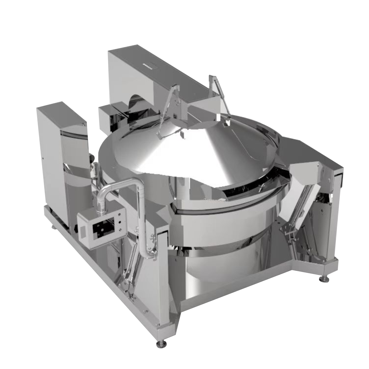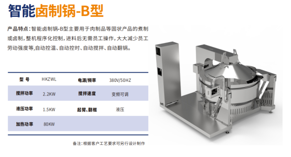 主要⽤于⾁制品等固状产品的煮制或⻧制,整机程序化控制,进料后⽆需员⼯操作,⼤⼤减少员⼯劳动强度等,⾃动控温、⾃动控时、⾃动搅拌、⾃动翻锅。